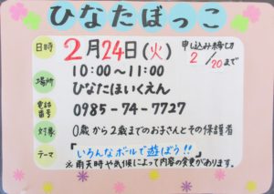 2月の子育て支援事業「ひなたぼっこ」は 2月24日(火)「いろんなボールで遊ぼう!」です。 電話でご予約ください。 ご参加をお待ちしています。※親子の情報交換・育児相談も随時実施しています。 お気軽にお問い合わせください。